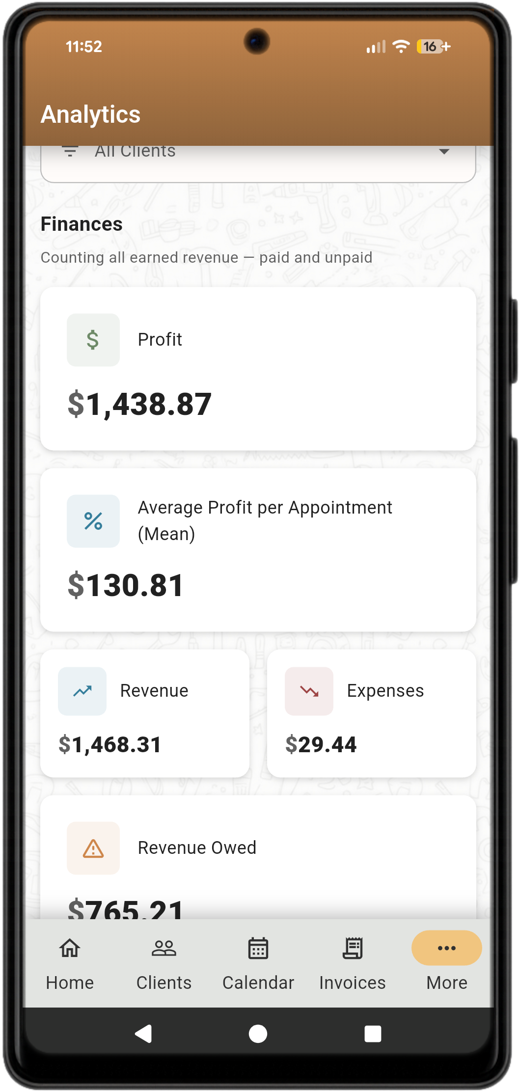Clients, Appointments, Finances, Communications